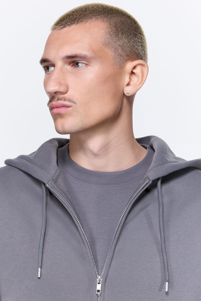 A top made of medium-thickness sweatshirt fabric with a soft, brushed interior. The hoodie features a drawstring, front zipper, and front pockets. It features dropped shoulders, long sleeves, and ribbing at the wrists and waist. It’s a loose fit for a comfortable yet not oversized silhouette.